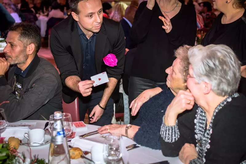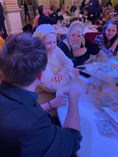 Magie de proximité réalisée à quelques centimètres des spectateurs, idéale pour les réceptions, diners, galas.